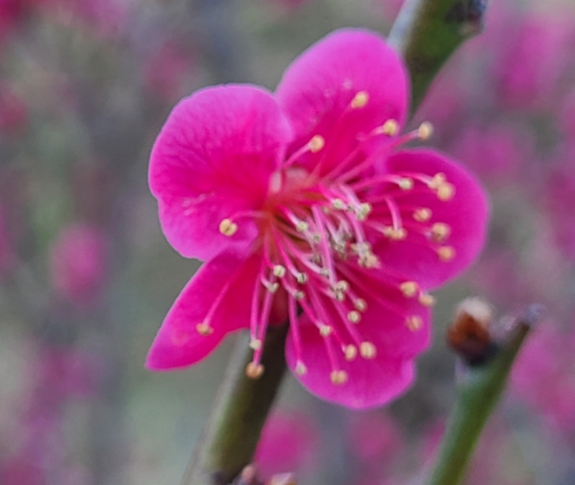 꽃잎과 꽃받침이 모두 붉은 색입니다. 홑꽃으로 만첩홍매화는 여러겹입니다.